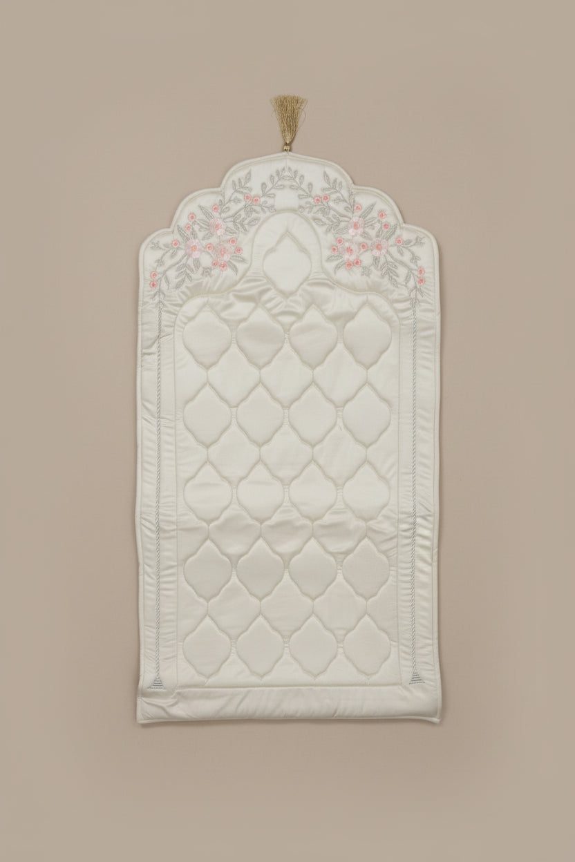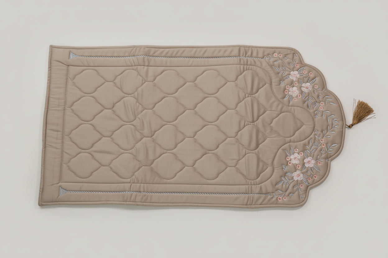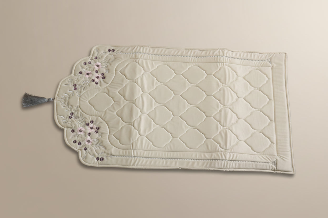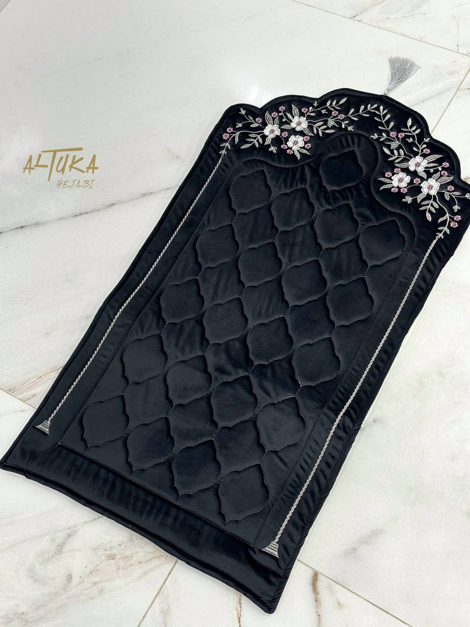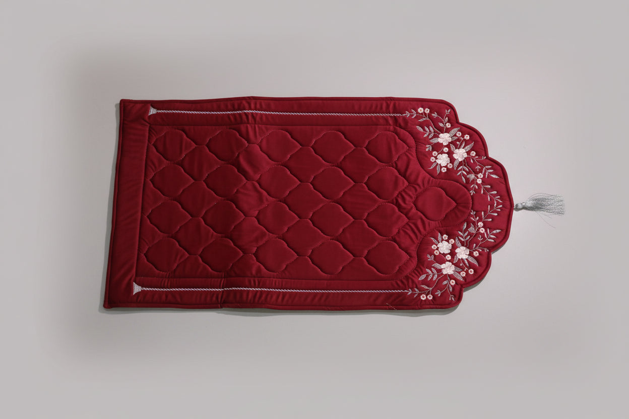 A Prayer rug with sponge lining , made in Syria, made of satan , lined with sponge from the inside, with embroidery with silk threads and satin. Distinctive and beautiful pieces for the special Ramadan atmosphere