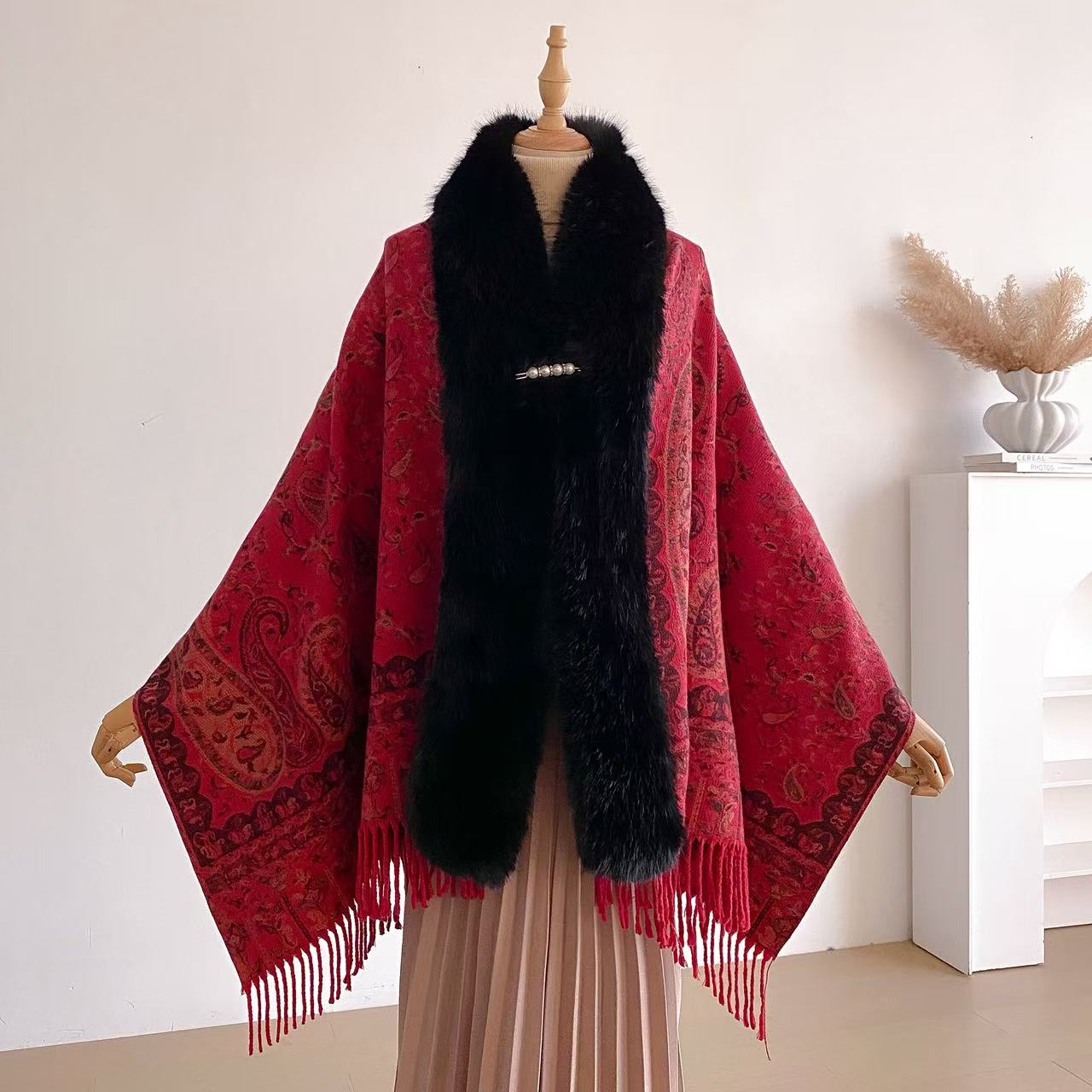 Luxurious cashmere shawl crafted for winter elegance and warmth. Features exquisite printed designs that add artistic sophistication to your ensemble, complemented by plush fur trim along the front for enhanced refinement. The premium cashmere fabric delivers exceptional softness and insulation, making it an ideal layering piece for the colder months. Versatile and timeless, this shawl effortlessly elevates any outfit with understated luxury and classic appeal.