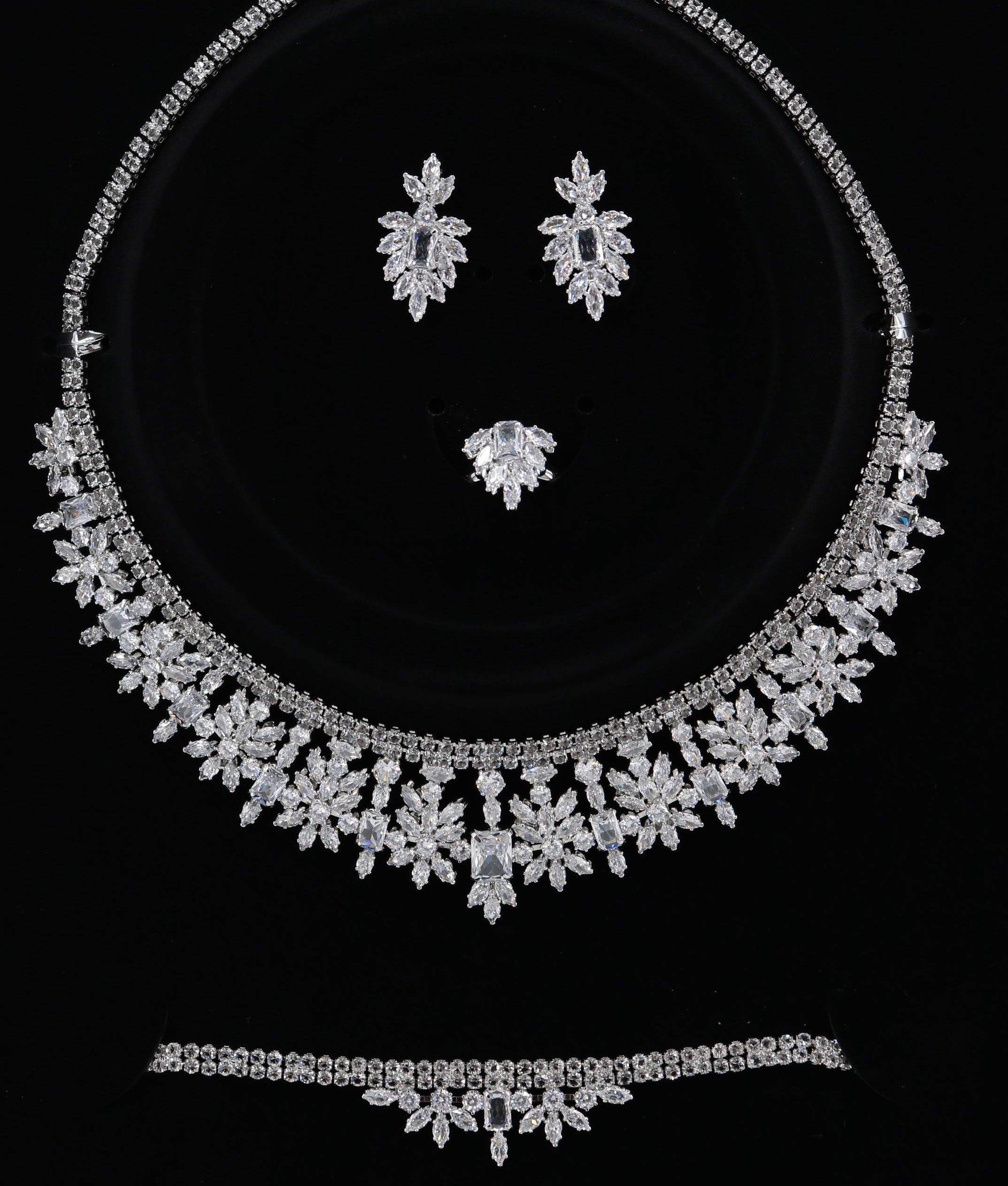 This accessory set includes earrings, a necklace, Ring and a bracelet, perfect for completing any outfit for special occasions and parties. Add a touch of elegance and sophistication with this versatile set. Made with quality materials, these pieces are sure to add the perfect finishing touch to your ensemble.