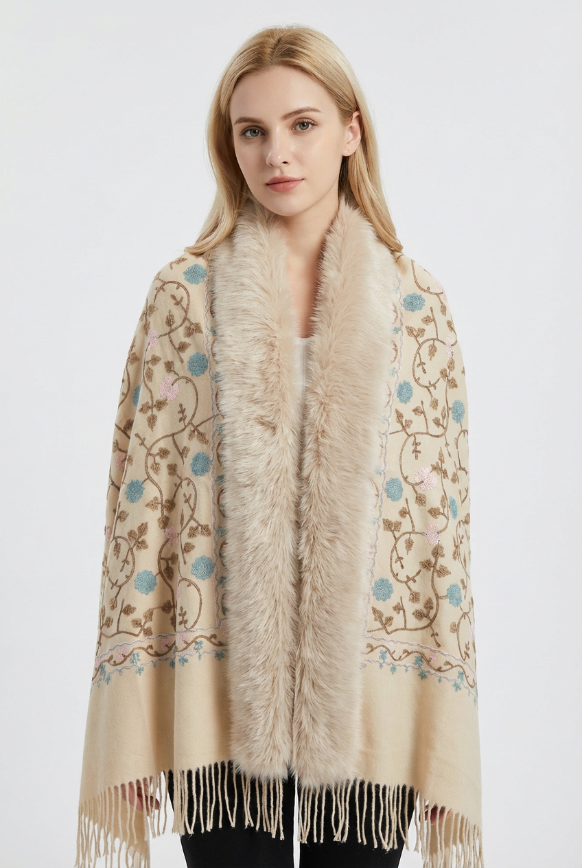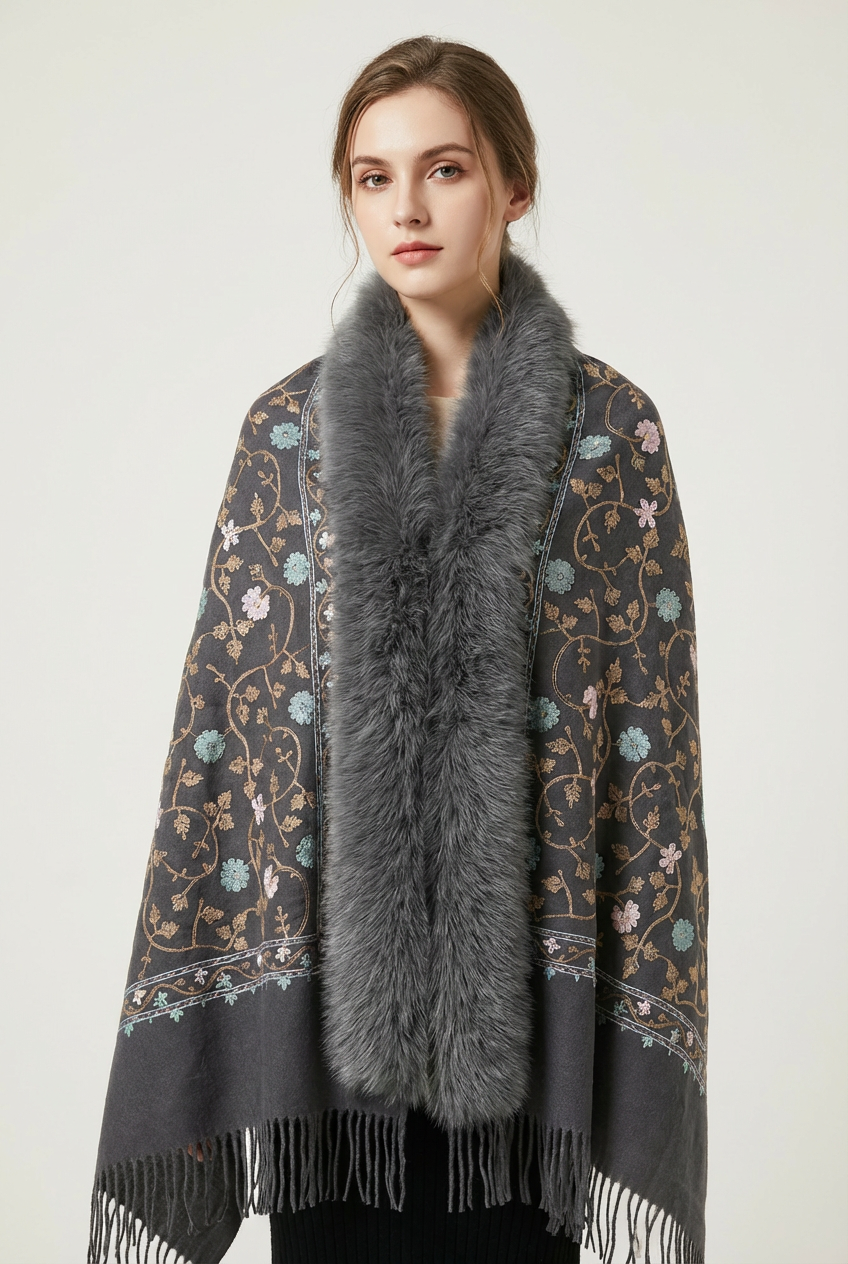 Elevate your wardrobe with this exquisite cashmere shawl, featuring intricate silk thread embroidery that captures light beautifully. The luxurious front fur trim adds sophistication and depth to your ensemble, creating an undeniably refined appearance. Crafted from premium cashmere, this piece delivers exceptional softness and warmth while maintaining its elegant drape. Versatile enough to complement diverse outfits and occasions, it seamlessly transitions from everyday wear to special events, making it an indispensable accessory for those who appreciate timeless luxury and impeccable craftsmanship.